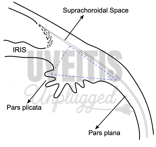 Ciliary body, in cross-section, is a triangular structure (in diagram # it can be compared as ∆ AOI). The outer side of the triangle (O) is attached to the sclera with suprachoroidal space in between. The anterior side of the triangle (A) forms part of the anterior & posterior chamber. In its middle, the iris is attached. The inner side of the triangle (I) is divided into two parts. The anterior part (2 mm) is known as pars plicata (corona ciliaris) and the posterior smooth (4 mm) is known as pars plana (orbicularis ciliaris). (1),(2)