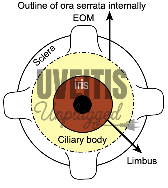 The ciliary body is the middle part of the uveal tract. It is a ring-shaped (slightly eccentric) structure that projects posteriorly from the scleral spur, with a meridional width varying from 5.5 to 6.5 mm. (1),(2) It is brown in colour due to melanin pigment. Anteriorly, it is confluent with the periphery of the iris (iris root), and the anterior part of the ciliary body forms a part of the anterior chamber angle. Posteriorly, the ciliary body has a crenated or scalloped periphery, known as the ora serrata, where it is continuous with the choroid and retina. The ora serrata exhibits forward extensions, known as dentate processes, which are well-defined on the nasal side and less so temporally. (1),(2) The ciliary body has a width of approximately 5.9 mm on the nasal side and 6.7 mm on the temporal side.