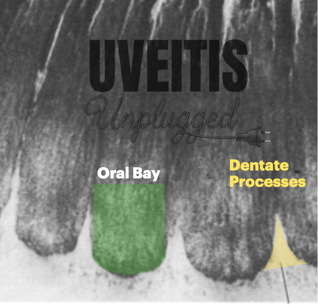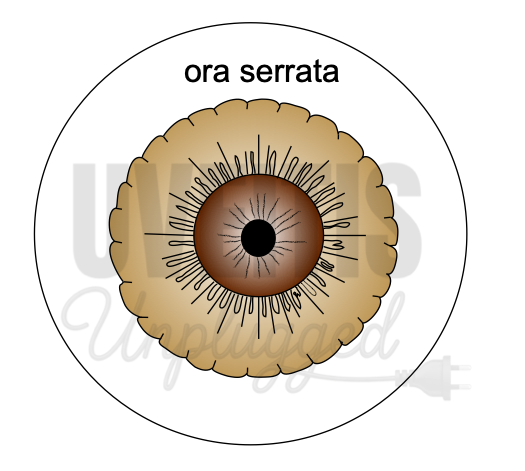 The ora serrata can be termed as the anterior border of the neurosensory retina. Ora serrata shows forward extensions into the retina, which are well-defined in the nasal side and less so temporarily. Dentate processes are “teeth-like” extensions of neurosensory retina into pars plana. There are approximately 20 to 30 dentate processes per eye. Ora bays are rounded extensions of the pars plana. (1),(2) Topographically, ora serrata corresponds to the insertion of the medial and lateral rectus muscles.