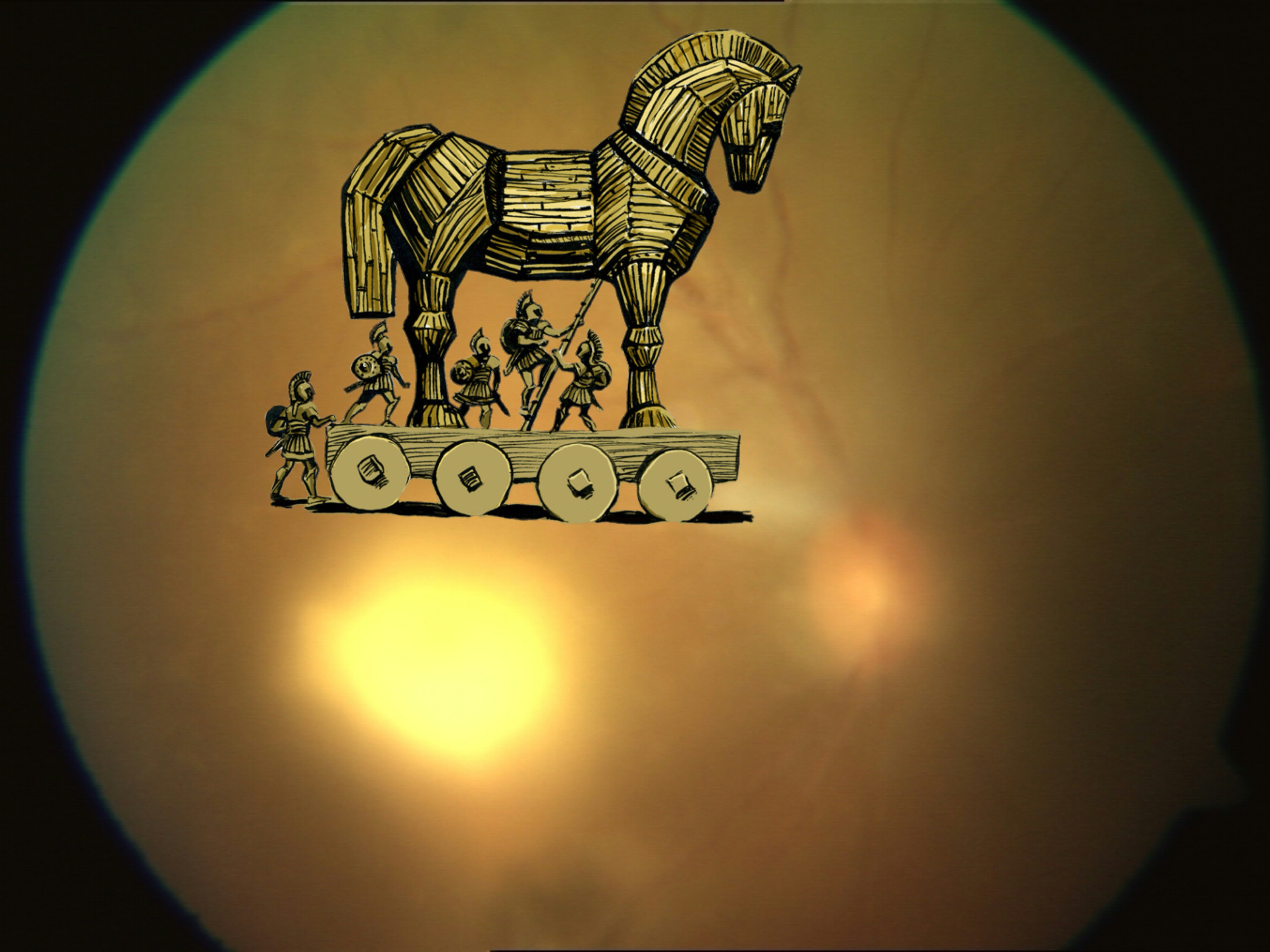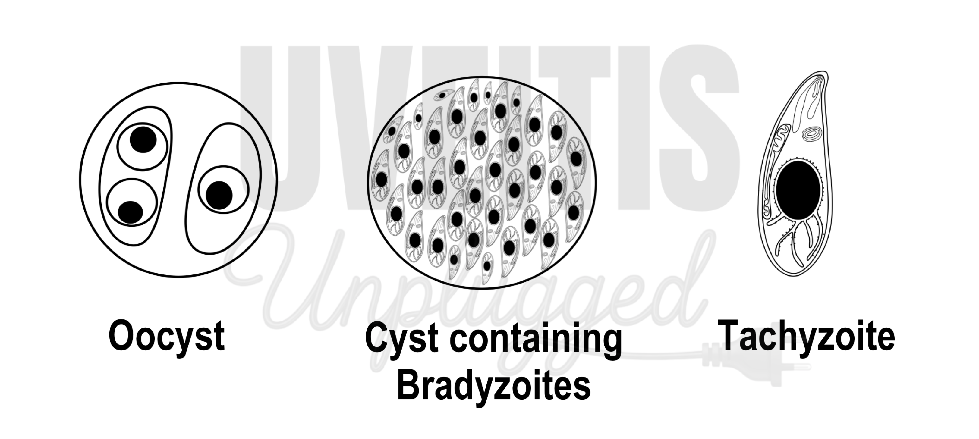 Metaphorically, the term “Trojan Horse” has come to mean any strategy that deceives a target through an outwardly benign appearance. Infection by Toxoplasma gondii follows a similar “Trojan horse” principle. There are three infectious stages of Toxoplasma gondii: the rapidly replicating tachyzoite, the slower-growing bradyzoite (within tissue cysts), and the sporozoite (within oocysts, the eggs of the parasite). Bradyzoites are the dormant or “sleeping” form residing within cysts. Tachyzoites are the active, rapidly multiplying form, primarily responsible for invasion and widespread destruction of ocular tissue.